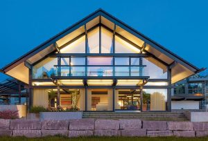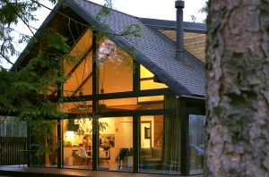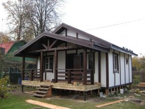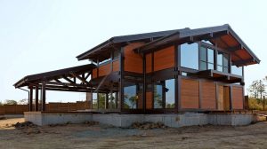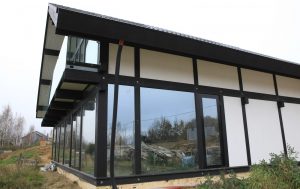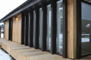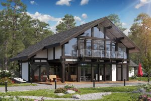 Не исключено оформления фасада дома в фахверковом стиле, которое заключается в видимой опорно-балочной системы их клееного бруса, фиброцементных панелей или мокрого фасада декоративной штукатуркой. Наполнение простенков возможно сэндвич-панелями, имеющими трехслойный пирог, включающий слой утеплителя-пенополиизоцианурата, и два слоя из стеклохолста с минеральным связующим. Такое покрытие позволяет создать идеальное сцепление с клеевыми и штукатурными составами.